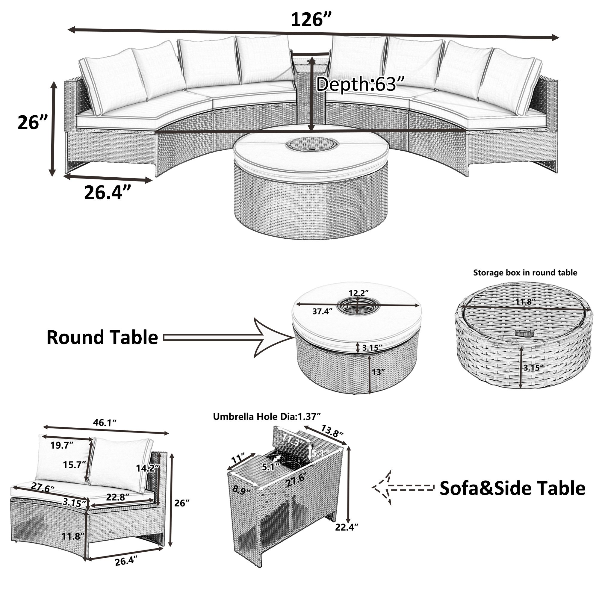 6 Pieces Outdoor Sectional Half Round Patio Rattan Sofa Set; PE Wicker Conversation Furniture Set w/ One Storage Side Table for Umbrella and One Multifunctional Round Table; Brown+ Gray