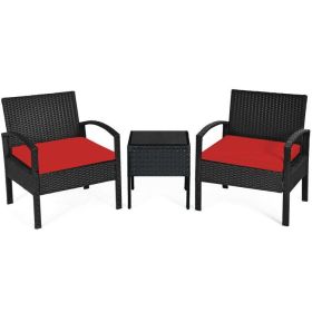 3 Pieces Outdoor Rattan Patio Conversation Set with Seat Cushions (Color: Red)